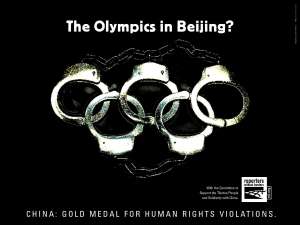 「無疆界記者組織」在譏諷北京欲爭辦二○○八年奧運的看板 上,刻意把奧運五環標志改成五銬標志,並寫著「北京舉辦奧運? 中國:侵害人權的金牌得主」的標語。該組織秘書長梅納德說,把 二○○八年奧運主辦權頒給北京,就像一九叁六年奧運會在納粹德 國舉行一樣地荒誕。梅納德說,「在像中國這樣彈壓異己的國家舉 行奧運,實在讓人無法接受。」