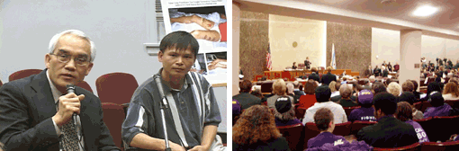 (圖片說明:上圖左,法輪功學員譚永潔在聽政會上做證;上圖右:11月6日市議會會議現場,芝加哥市長Richard Daley主持市議會。)