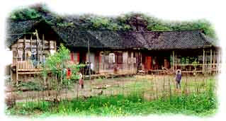 歷來對腳下的路特別註意,我的足印竟然和這山谷中的村寨有一面之緣,我進了村寨的歷史還是村寨進了我的歷史?路邊有吊腳樓,正在興建中。隨意找椅子歇了,和屋主攀談起來,原來這吊腳樓的修建還頗為講究,它分為上下兩層,上層為居室或待客,下層用幾根圓柱支撐,貯藏糧食、堆放雜務或者養牲口。吊腳樓四腳或覆蓋走廊的“絲檐”是人重點裝飾的地方,婀娜多姿,雕刻著吉祥圖案,顯示出木工師傅的匠心和耐心來。滿鼻的樹木的香味,這香味入夢,恐怕夢中也在逸人的自然之中,該是何等的美景。