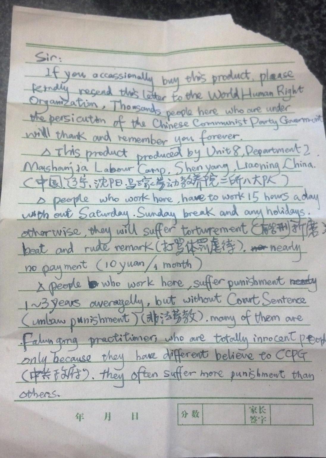 信中寫道:“先生:如果你偶然間購買了這個產品,請幫忙把信轉交給世界人權組織。我們這裏受到中共政權迫害的數千人將永遠感謝並記住您。”