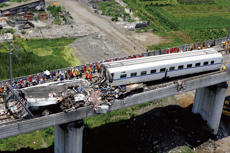 ![]() 2011年7月23日溫州動車事故造成40人死亡、172人受傷。中共有關部門卻聲稱「無生命跡象」而停止搜救;立即開始迫不及待粉碎車頭、車廂、就地掩埋,震驚全球。 |