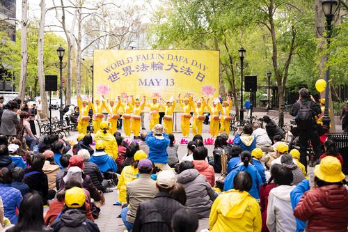 打印機版 | 【投稿/反饋】 文/紐約法輪功學員今年的5月13日是法輪大法弘傳27周年暨第20屆“世界法輪大法日”,也是慈悲偉大的師尊68歲華誕。2019年5月9日中午時分,紐約部份法輪功學員齊聚曼哈頓聯合國總部外的“哈瑪紹廣場”,以豐富多彩的傳統表演慶祝這一殊勝的節日。眾多學員向師尊表達感恩之情,並希望全世界都來了解法輪大法的美好。