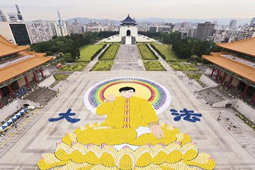 2012年4月29日,臺灣部分法輪功學員七千四百人在臺北自由廣場,排出李洪志師父法像圖形,宏偉壯觀。(明慧網) |