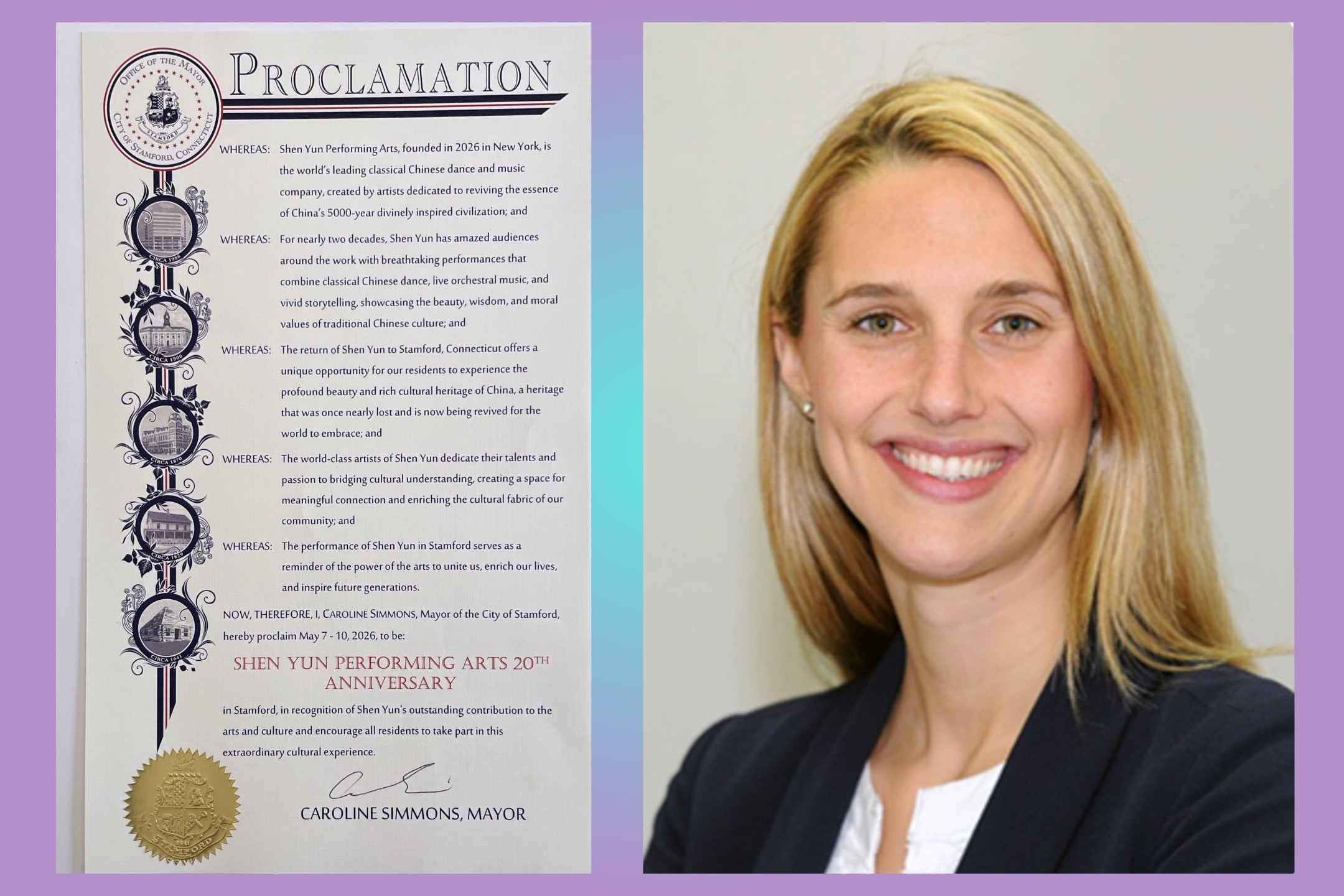 “因此,如今,我,斯坦福德市市長卡羅琳‧西蒙斯,特此宣布2026年5月7日至10日為:神韻藝術團創立20周年紀念日,以表彰神韻對藝術與文化的傑出貢獻,並鼓勵所有居民參與這一非凡的文化體驗。”
