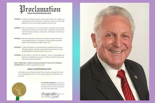 ![]() 2025年12月,康州諾沃克市(Norwalk)市長哈裏·W·裏林(Harry W Rilling)簽發“神韻藝術團褒獎令”。 |
