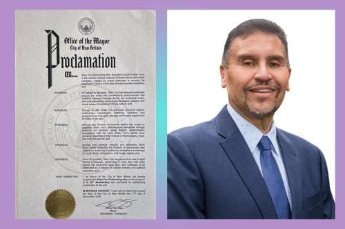 ![]() 2025年12月,康州紐不列顛市(New Britain)市長鮑比·桑切斯(Bobby Sanchez)簽發“神韻藝術團褒獎令”。 |