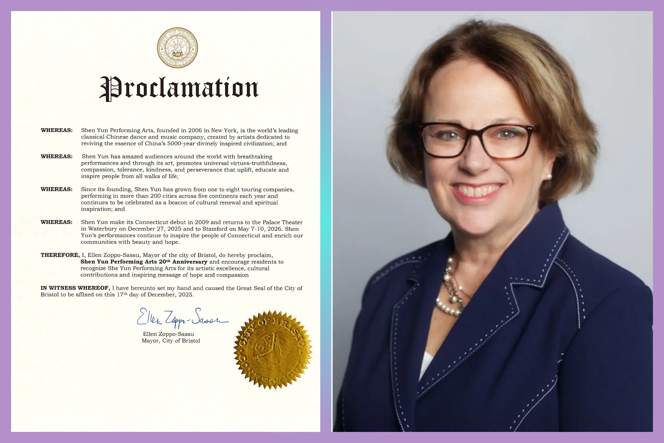 ![]() 2025年12月,康州布裏斯托爾市(Bristol)市長艾倫·佐波-薩蘇(Ellen Zoppo-Sassu)簽發“神韻藝術團褒獎令”。 |