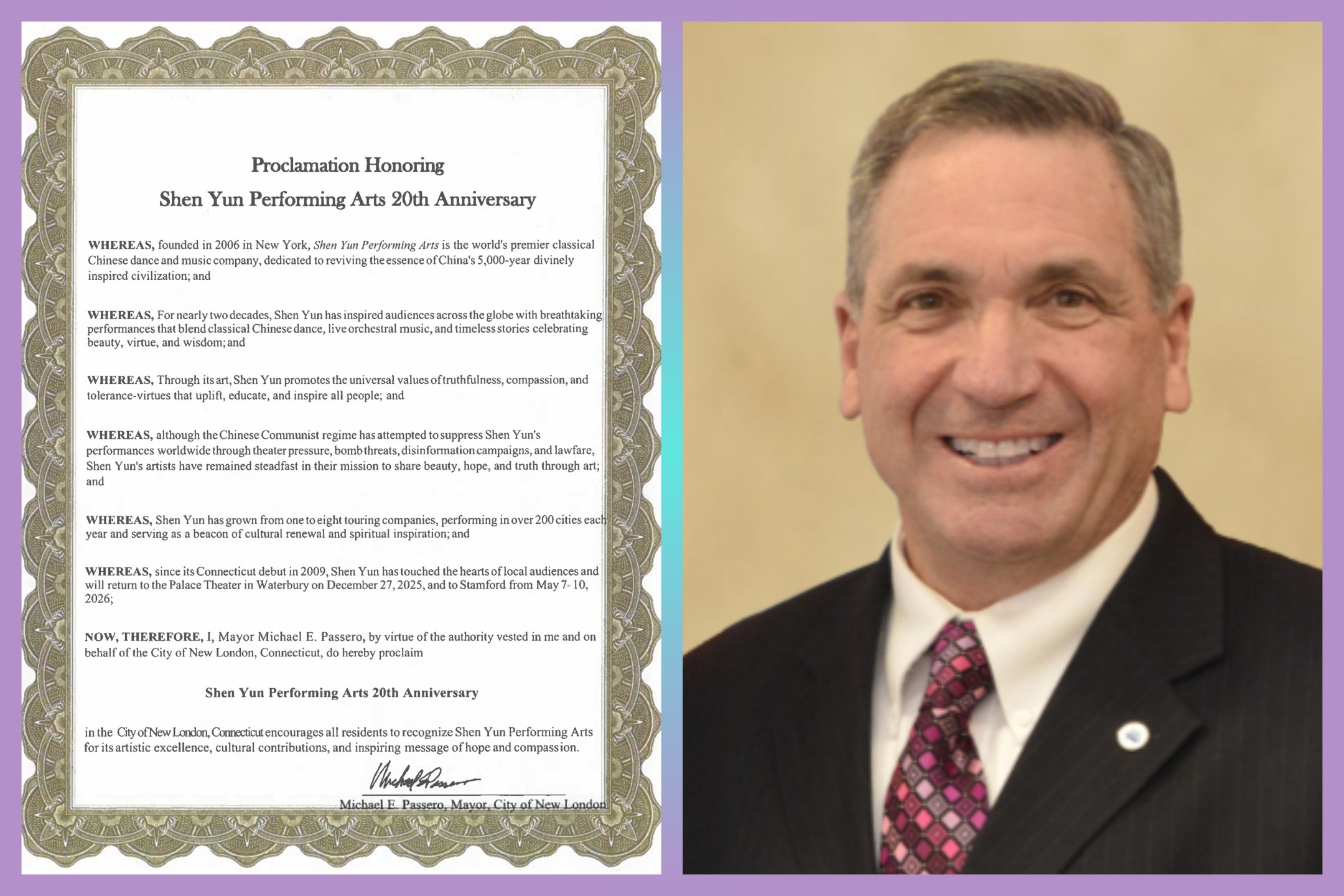 ![]() 2025年12月,康州紐倫敦市(New London)市長邁克爾·E·帕塞羅(Michael E. Passero)也在褒獎令中“敬賀神韻藝術團創立20周年”。 |