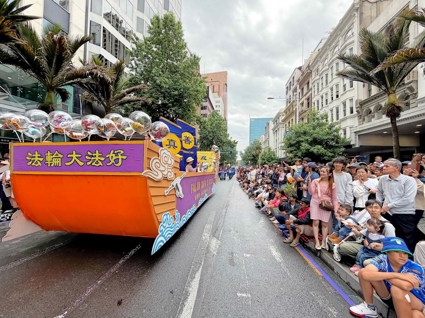 新西蘭法輪功學員十一月二十九日至三十日參加了北島及南島四大城市、共五場盛大的聖誕遊行活動,包括新西蘭最為隆重的奧克蘭聖誕大遊行、奧克蘭奧雷瓦(Orewa)區、羅托魯瓦(Rotorua)、但尼丁(Dunedin)及南島最南端城市因弗卡吉爾(Invercargill)。天國樂團藍白相間的古典服飾、飽滿宏亮的銅管樂聲與現場節慶氣氛完美融合,令許多觀眾連連稱贊。美麗的法船上中英文真、善、忍理念非常醒目,緊隨其後的舞龍隊以靈動的龍身、富有動感的節奏,引發孩子們陣陣驚呼,街道兩旁的人群不斷揮手致意。