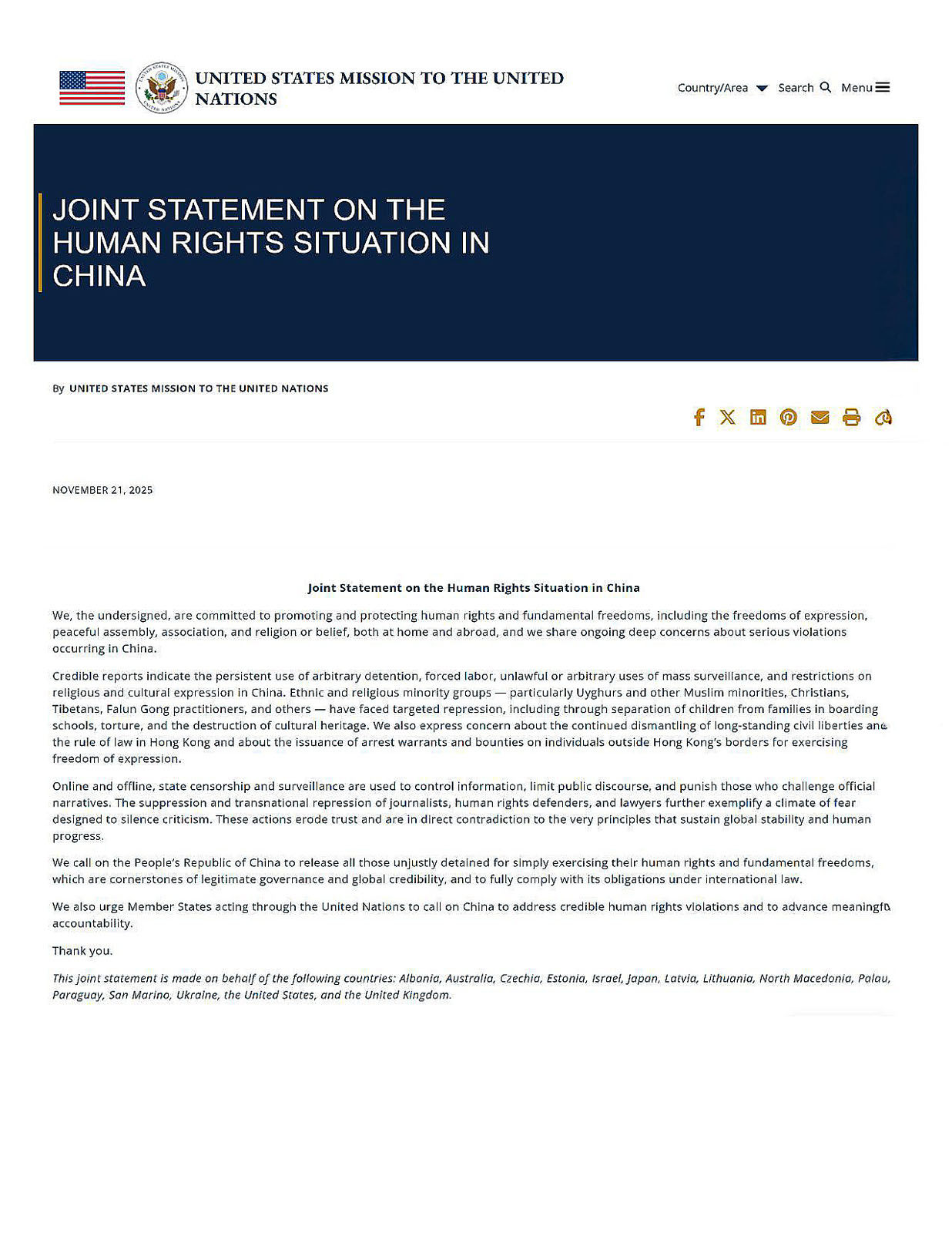 打印機版 | 【投稿/反饋】 二零二五年十一月二十一日,美國、英國、澳大利亞、阿爾巴尼亞、捷克、愛沙尼亞、以色列、日本、拉脫維亞、立陶宛、北馬其頓、帕勞、巴拉圭、聖馬力諾、烏克蘭十五個聯合國成員國發表關於中國人權狀況的聯合聲明(Joint Statement on the Human Rights Situation in China),譴責中共有針對性的迫害維吾爾族和其他穆斯林少數群體、基督徒、藏族、法輪功修煉者等群體。聯合聲明說:人權和基本自由是合法治理和全球信譽的基石,我們呼籲中華人民共和國釋放所有因僅僅行使其人權和基本自由而被不公正拘押的人,並全面履行其在國際法下的義務。我們也敦促各成員國通過聯合國呼籲中國解決人權侵犯問題,並推動切實的問責機制。該聲明由美國駐聯合國大使邁克·沃爾茨(Mike Waltz)代表閱讀,表達了對中國“嚴重、持續且系統性”人權侵犯的深切關註。這是聯合國框架下的一次多邊行動,旨在敦促中國政府履行國際人權義務,並呼籲全球推進問責機制。