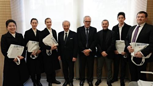 ![]() 2月13日早上,拉齊奧大區主席的政治顧問西爾瓦諾‧莫法(左四)、法布裏齊奧·莫利納(右四)和神韻紐約藝術團代表合影。(新唐人電視臺) |