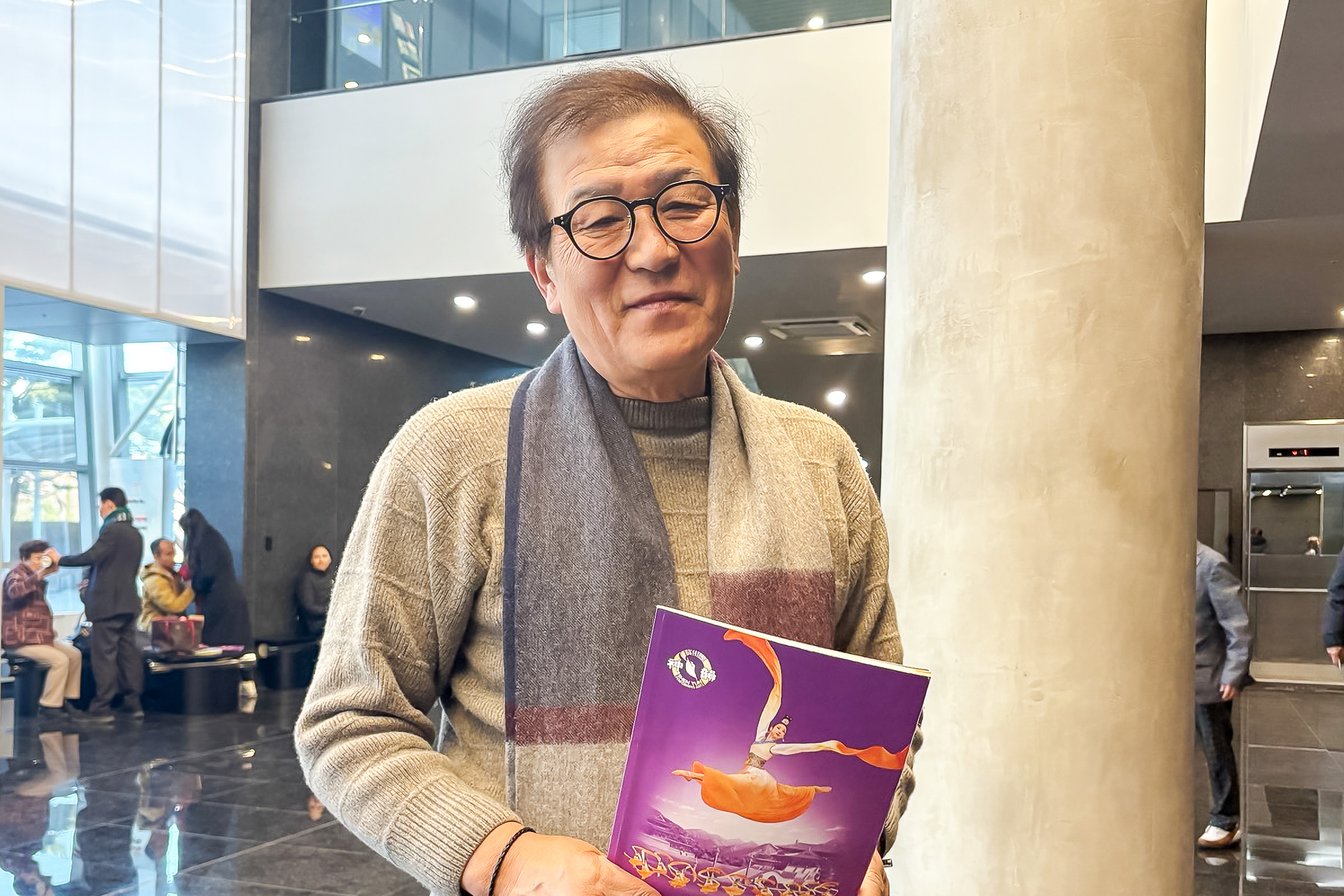 ![]() 2月20日下午,美術系教授石點德觀賞神韻在韓國大邱的演出。(大紀元) |