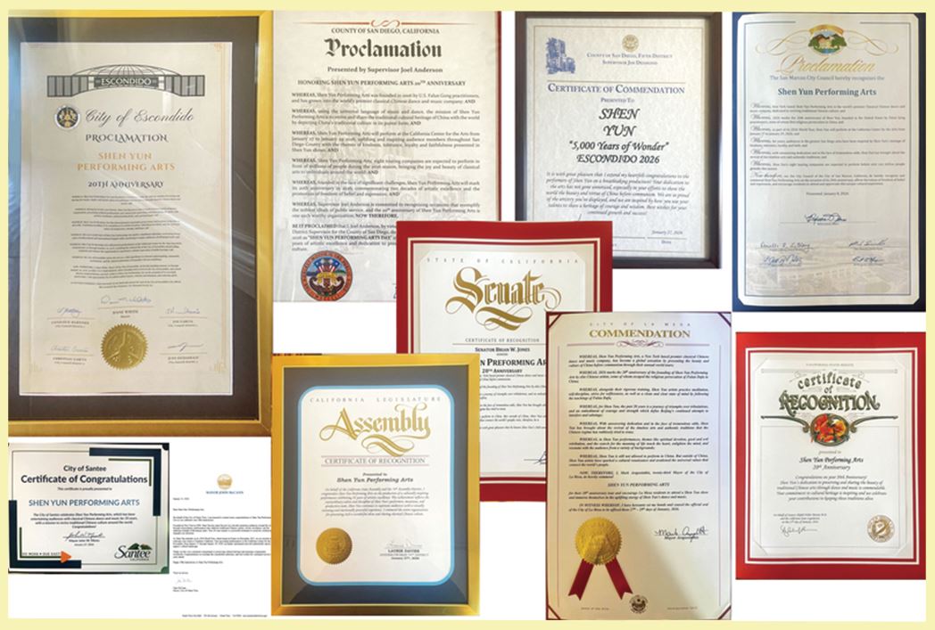 ![]() 神韻藝術團於2026年1月27日至29日,在美國加州聖地亞哥上演3場。當地政要向神韻頒發褒獎,祝賀神韻20周年“凱旋之旅”。(明慧網合成) |