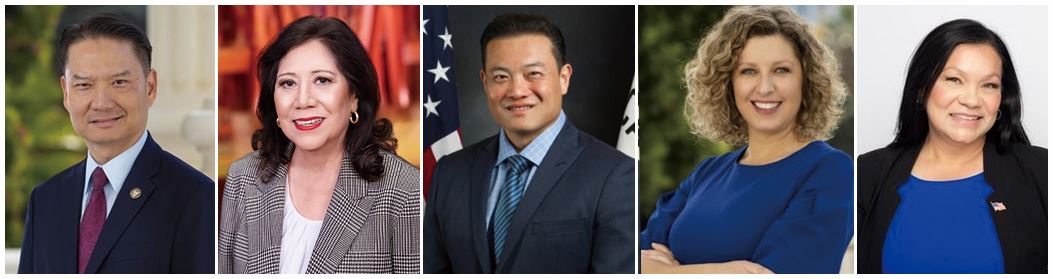 圖片說明:(左起)加州第70選區州眾議員謝德智(Tri Ta);洛杉磯縣政委員會主席希爾達·索利斯(Hilda Solis);加州第59選區州眾議員陳立德(Phillip Chen);加州第40選區州眾議員皮拉爾·斯基亞沃(Pilar Schiavo);加州第58選區州眾議員萊蒂西亞·卡斯蒂略(Leticia Castillo)。(明慧網合成)