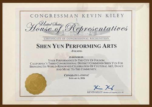 ![]() 1月6日,神韻藝術團在加州佛森市演出當天,加州第三選區國會眾議員凱文·基利(Kevin Kiley)特別給神韻主辦方發來褒獎狀,表彰神韻的貢獻。 |