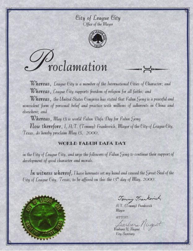 里戈市市长汤米.弗兰克维切致“世界法轮大法日”公告