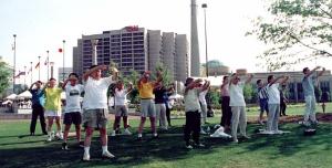 世界法轮大法日,亚特兰大学员分组分别在市中心的奥林匹克公园及游人不断的石头山公园炼功弘法。