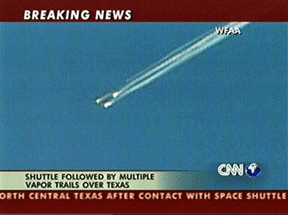 报道说,美国总统布什在马里兰已就航天飞机著陆事件作了简短讲话,并准备回到白宫。暂时不太清楚航天飞机上究竟出现了什么问题。不过,电视画面中可以清楚看到在得克萨斯州达拉斯市上空的蔚蓝天空中,哥伦比亚号飞过的地方出现了数条白色的尾巴。
