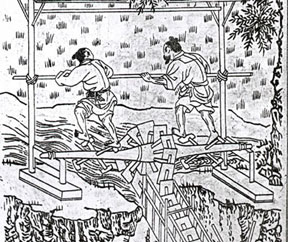 “以人运车车运辐,一辐上起一辐伏。辐辐翻水如泻玉。大车二丈四,小车一丈六。小以手运大以足,足心车柱两相逐。左足才过右足续,踏水浑如在平陆。高田低田足灌沃。不惜车劳人力尽,但愿秋成获嘉谷。” 这首《踏车曲》形象的描绘出中国农村古老的提水机具-翻车。