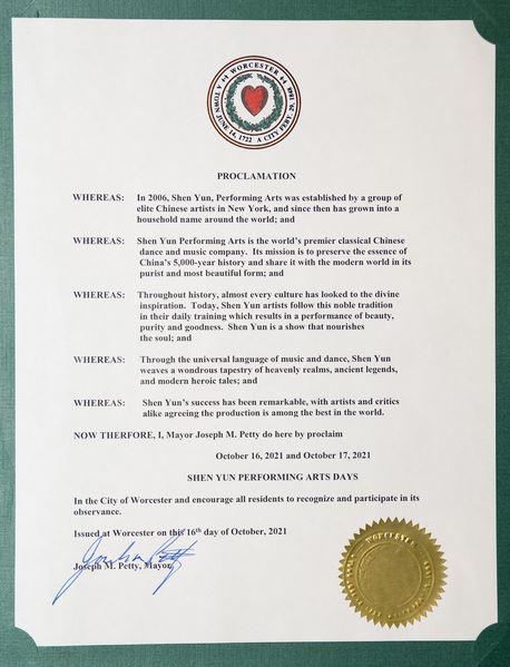 因此:我,市长约瑟夫‧M‧佩提在此宣布,2021年10月16日和2021年10月17日是伍斯特市的神韵艺术团日,并鼓励所有居民关注并参与观赏。
