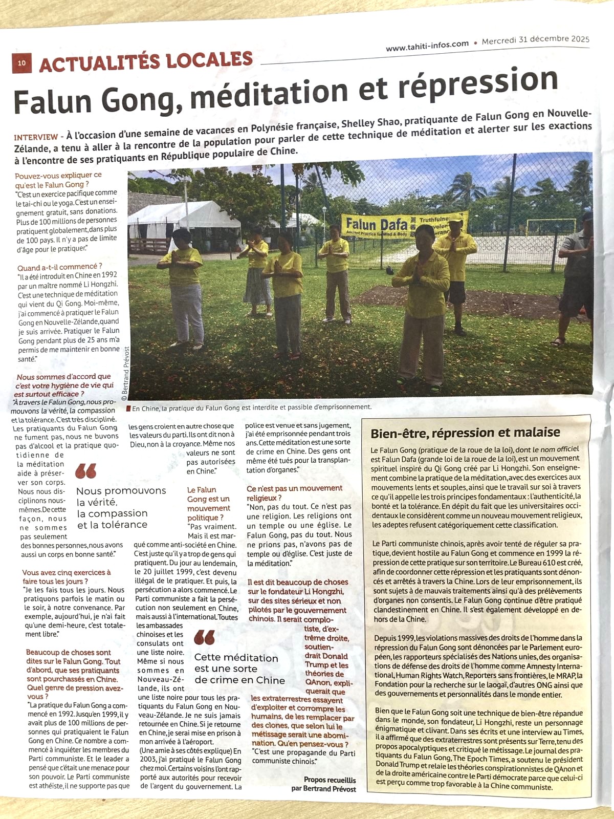 在二零二五年圣诞假期和二零二六年新年期间, 新西兰部分法轮功学员来到南太平洋的旅游胜地——大溪地岛(Tahiti),在自由市场、汽车站、海边、市中心等繁华地带,展开弘法、炼功和讲真相活动,向当地的居民及游客介绍法轮大法的美好,以及中共迫害法轮功的真相。当地最大的媒体《大溪地信息报》(Tahiti Infos)对学员们做了专访,在当地新闻版以《法轮功、打坐和被镇压》为题,以整版的篇幅全面的报道了有关法轮功的真相,介绍了法轮大法以及中共自一九九九年七月以来,在中国对法轮功所进行的残酷迫害,包括中共实施的跨国镇压,在全世界利用外交和经济胁迫对法轮功进行抹黑、让许多人无视迫害、保持沉默等等。最后还分享了此行期间当地人急切想学法轮功的故事。