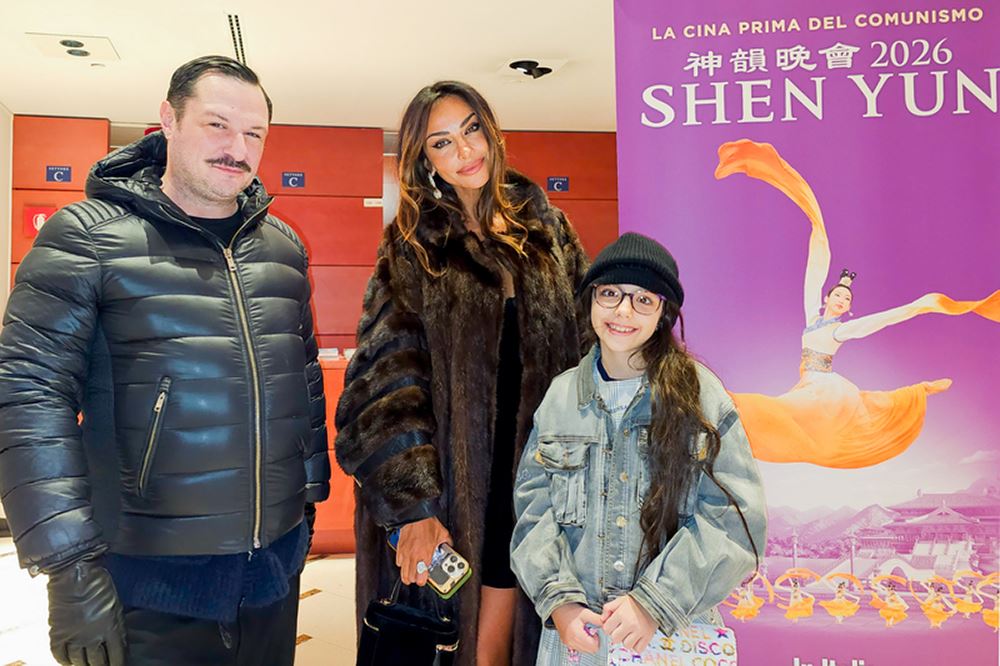 ![]() 1月16日晚,活跃在意大利的国际知名模特、罗马尼亚女演员兼社会活动家玛达利娜・吉内亚(Madalina Ghenea)(中)和女儿在米兰观赏了神韵演出。(大纪元) |