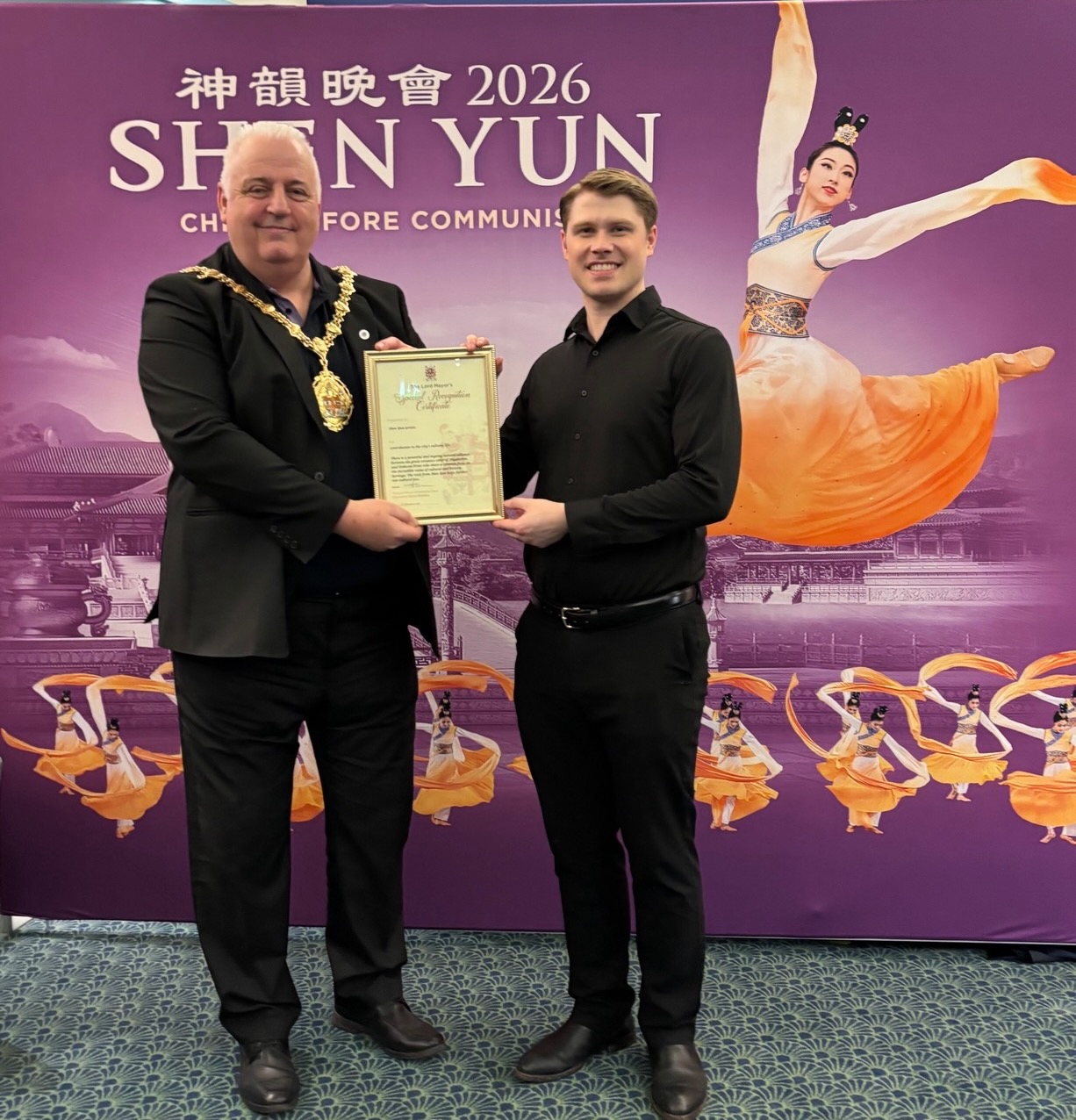 打印机版 | 【投稿/反馈】 文 : 海外大法弟子2026年2月18日下午,英国斯托克-特伦特市(Stoke-on-Trent)市长史蒂夫·沃特金斯(Steve Watkins)携夫人出席了神韵艺术团在摄政剧院的第2场演出。演出结束后,沃特金斯市长向神韵艺术团颁发了市长特别表彰证书,以表彰其对本市文化生活作出的杰出贡献。