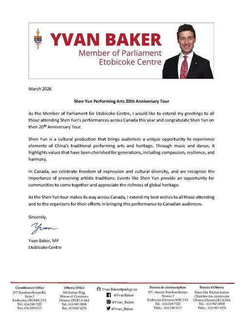 国会议员德里德在视频中表示:“神韵艺术团致力于复兴中华五千年传统文化,同时彰显善良、勇气、自由等普世价值,这些理念深深引起了来自各行各业加拿大人的共鸣。祝愿神韵在加拿大巡回演出中再创佳绩,并向所有参与者致以敬意。20年来,你们始终秉持艺术追求,在逆境中展现非凡韧性。”