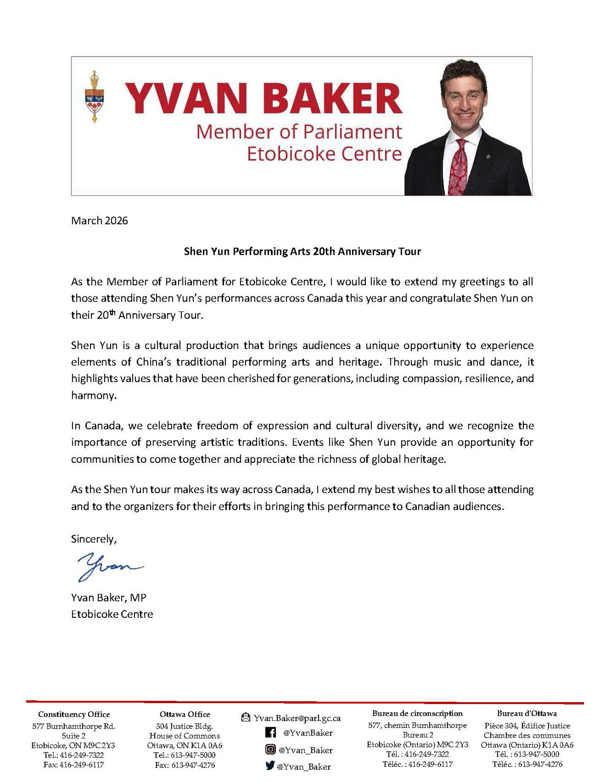 ![]() 国会议员伊万·贝克(Yvan Baker)的贺信。 |