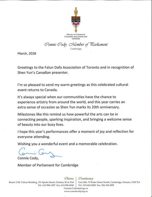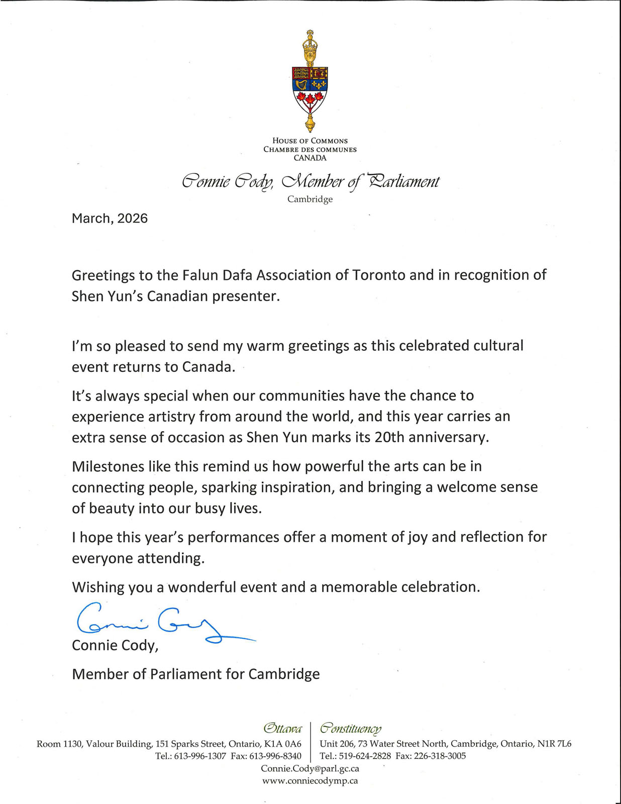 国会议员科迪祝贺神韵成立20周年,她在贺信中表示:“这样的里程碑时刻提醒我们:(神韵)艺术具有非凡的力量,她能联结人心、激发灵感,为我们繁忙的生活带来一份难得的美好。”