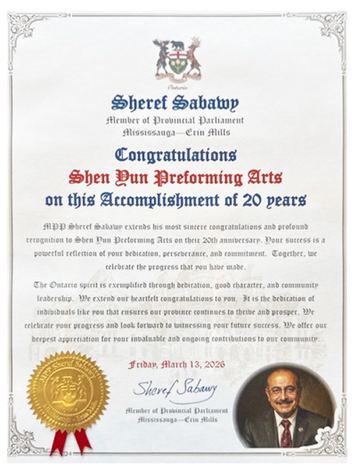 ![]() 安大略省省议员谢里夫・萨布维(Sheref Sabawy)为神韵颁发的褒奖状。(大纪元) |