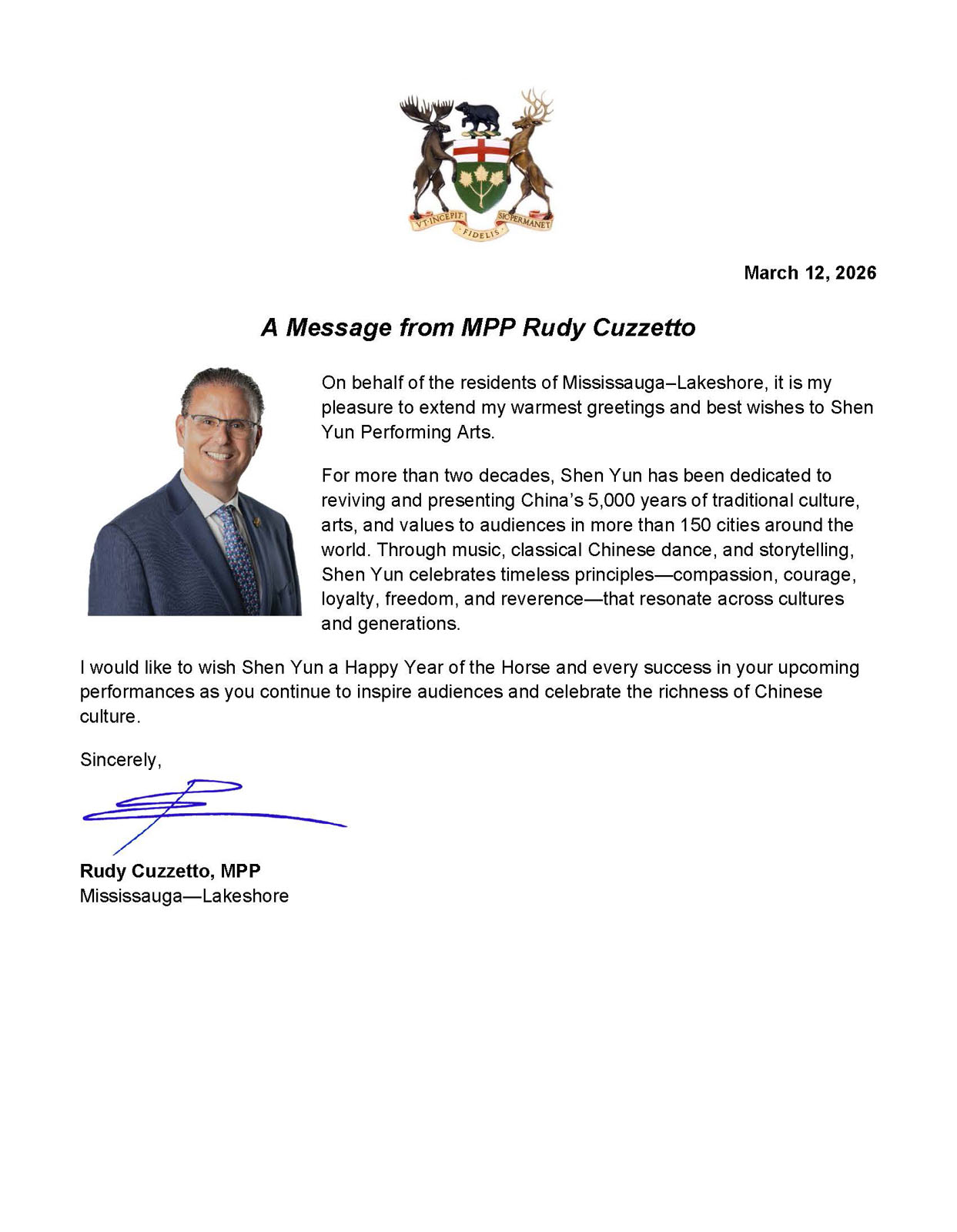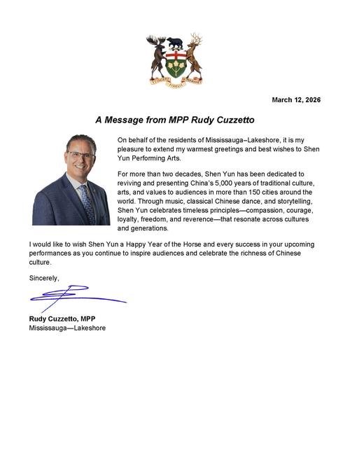 安省省议员库泽托在贺信感谢神韵艺术团:“复兴和承传中国五千年传统文化、艺术和价值观,并将其带给了全世界150多个城市的观众。”