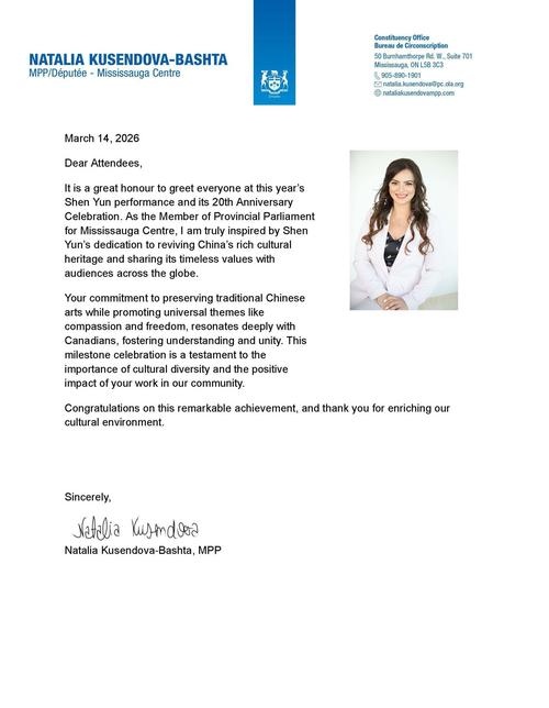 省议员库森多娃-巴什塔在贺信中表示,“作为密西沙加中心选区的省议员,我被神韵致力于复兴中华悠久文化遗产、并向全球观众传递其永恒价值的努力深为感动,并深受启发。”