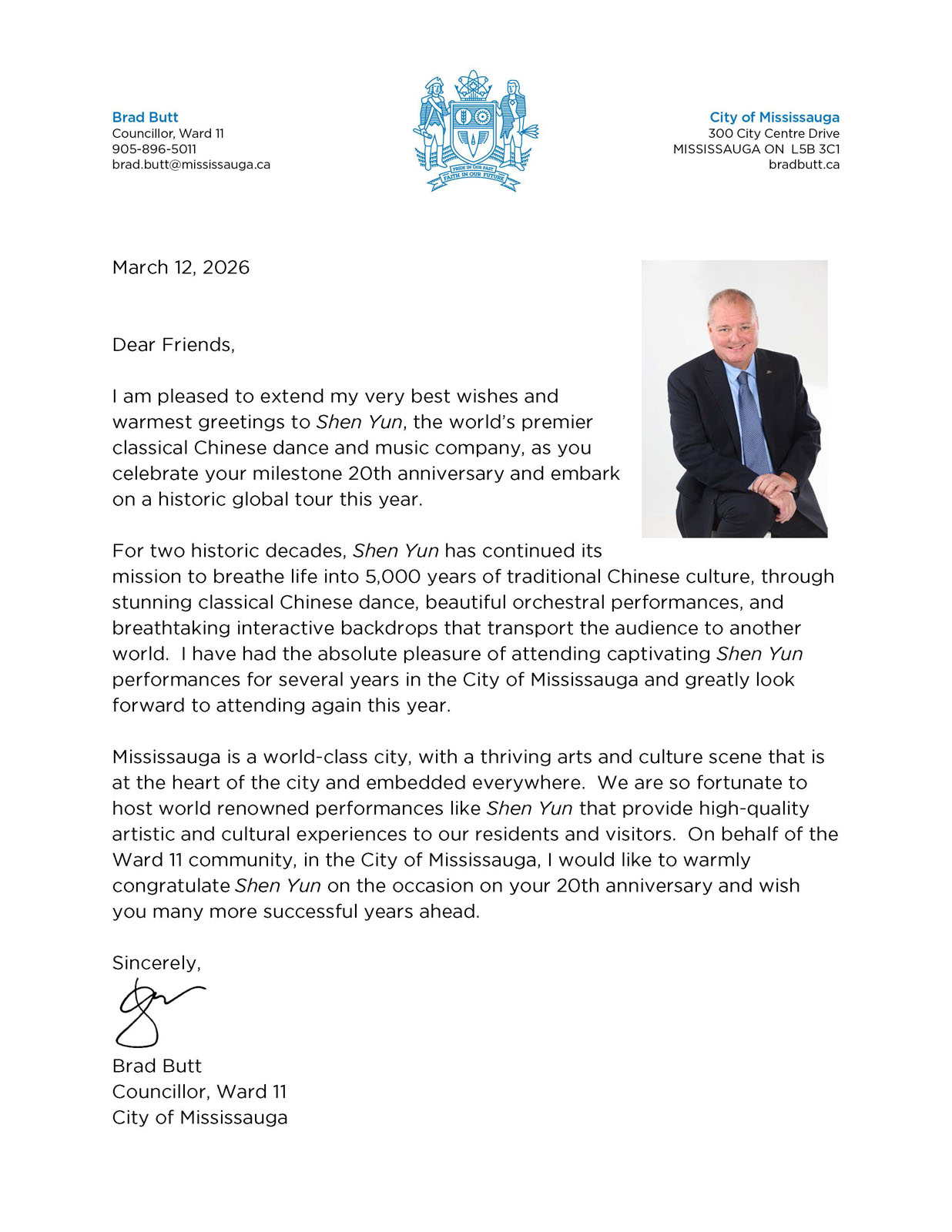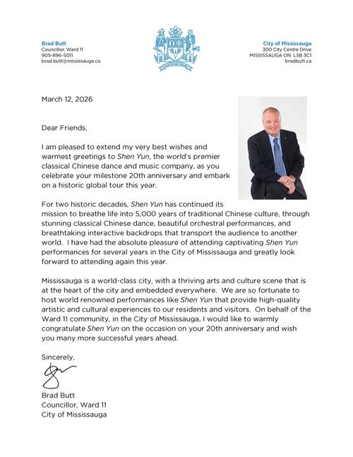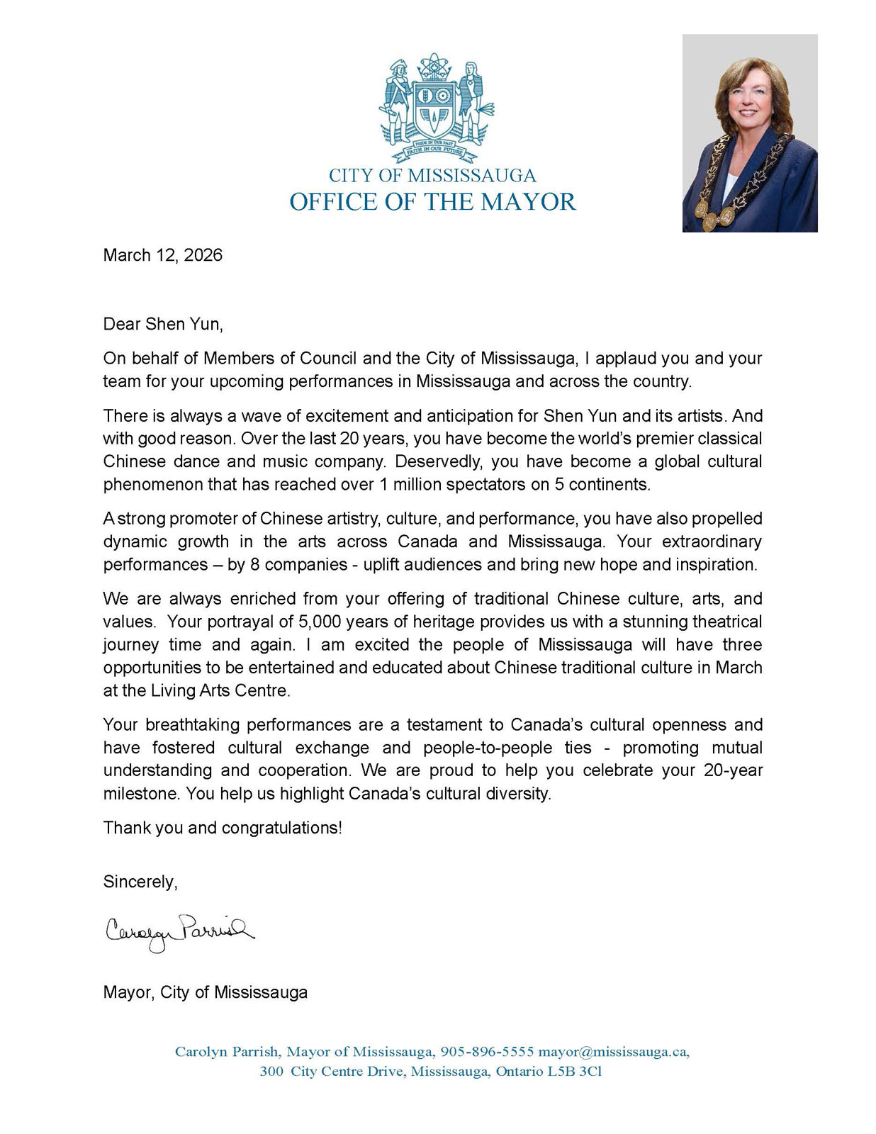 密西沙加市长帕里什在贺信中写道,“在过去20年里,神韵已成为世界首屈一指的中国古典舞蹈和音乐演出团体。神韵演出享誉全球,吸引了五大洲超过百万观众,实至名归。”