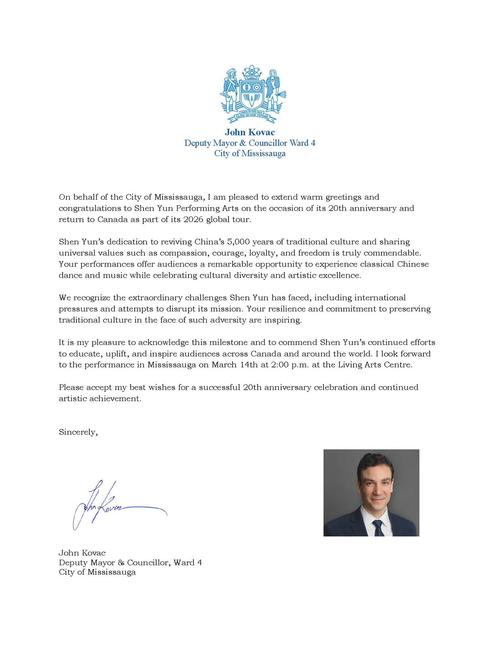 密西沙加市市长致贺:神韵享誉全球 实至名归