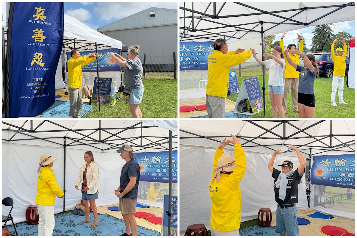 新西兰法轮功学员三月十四日至十五日参加了在奥克兰(Auckland)举行的第103届库姆展(Kumeu Show),向过往市民介绍法轮大法,并现场展示五套功法。祥和舒缓的炼功场面吸引不少人驻足观看,有些人当场学炼功法。一位观众表示,从学员的炼功场地十米开外,就能感受到一种平静与祥和的能量。来自社区巡防组织(Community Patrol)的保罗(Paul)在接受采访时,对法轮功学员长期坚持和平传播真相表示赞赏。他说:“我认为你们正在做的事情非常好。象你们这样站出来,让人们了解真实情况,是非常重要的。”保罗表示,“共产主义在世界任何地方都没有成功过,它是残酷而且腐败的制度。表面上说人人平等,而实际上,上层的人享受所有好处,而底层的人却在受苦。”他认为,正因为如此,象法轮功学员这样坚持和平、坚持信仰的人显得更加可贵。“你们一直在努力告诉世界发生了什么,这是一件非常有意义的事情。需要有人站出来,坚持正义、传递真相。”