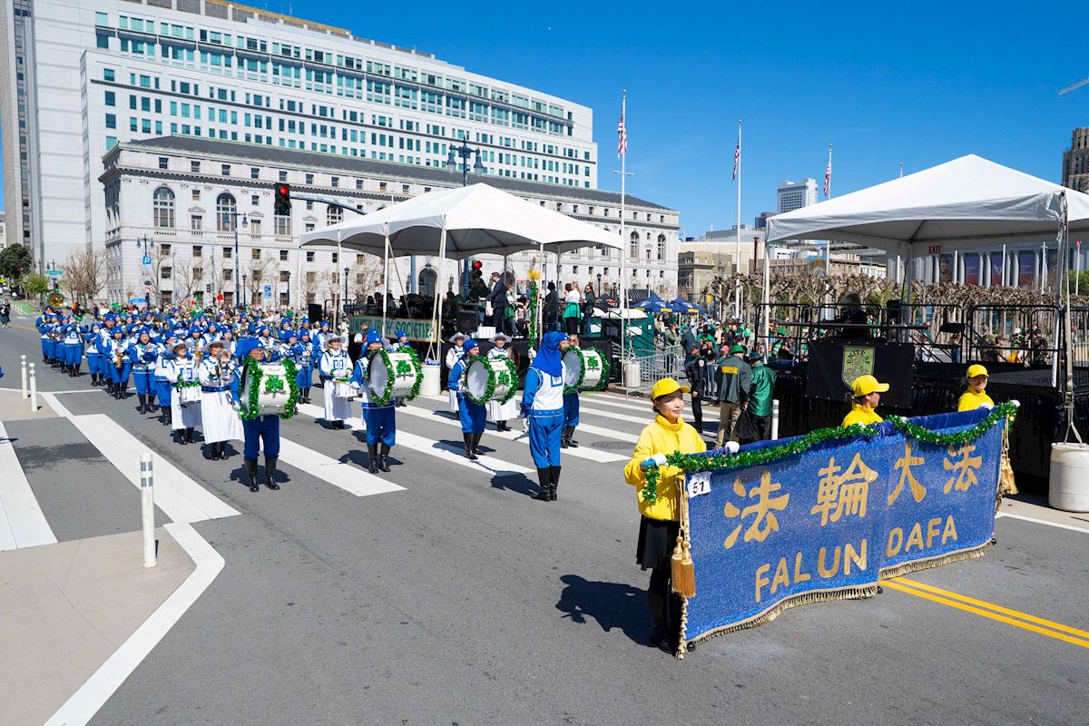 打印机版 | 【投稿/反馈】 美国旧金山湾区的法轮功学员三月十四日参加了旧金山第175届圣派翠克日大游行(St Patrick's Day Parade),受到主办方和民众的欢迎。经过主席台时,主持人说:“现在来的队伍是法轮大法天国乐团,天国乐团每年都来参加游行。”“他们的服装都是专门定制的,形似中国古代唐朝的武士,正面镶着音乐的乐字。让我们为他们鼓掌加油,感谢你们每年都来参加游行。”主持人说:“下面来的是法轮功炼功队,他们身穿亮丽的镶有红边的黄色炼功服,今年是他们第十六年参加游行了,很高兴今年能再次见到你们。”爱尔兰裔美国人卡罗琳(Caroline)也很喜欢法轮功学员的队伍,她说,“法轮功学员的队伍很棒,带给人快乐。真、善、忍很好,是人们需要遵循的准则,做到真、善、忍非常重要。”三月十五日周日下午,纽约上州橙县首府戈申(Goshen)举行了第四十届中哈德逊地区圣派翠克节(St. Patrick’s Day)游行,法轮功学员也应邀参加,为游行带去了横幅队、仙女队、炼功队和太鼓表演,给这个西方节日增加了独特的东方文化韵味,成为游行中亮眼的风景。来自意大利的西人法轮功学员康斯坦丁·斯卡布里诺(Kosta Scabrino)参加了游行,他表示希望让更多人了解法轮大法的美好,并能从中获益。他说:“法轮功已经成为我和太太生活中的重要部分,我们获益良多,所以也希望让更多人了解法轮功的美好。”斯卡布里诺介绍自己从二零零三年经别人介绍就开始修炼法轮功,慢慢他意识到这是个对自己非常有益的功法,“我戒掉了吸烟和喝酒,而且感觉身心愉悦,内心更加平衡稳定。”通过阅读法轮大法的主要著作《转法轮》,斯卡布里诺从中得到了许多问题的答案,“明白一些人生根本的问题,比如我从哪里来、要到哪里去,这让我非常受益,也帮助我面对生活中遇到的各种事情、考验和困难。”