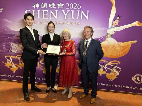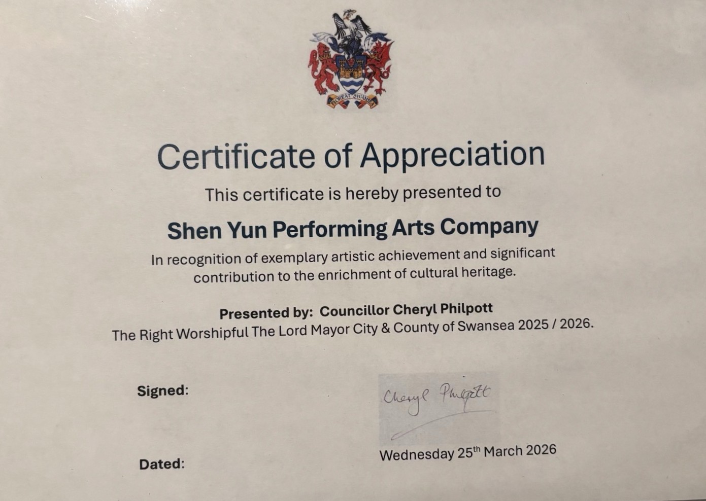 3月26日,神韵艺术团在英国斯旺西市的第四场演出圆满落幕。3月25日晚,斯旺西市长菲尔波特(Cheryl Philpott)议员与丈夫观看演出后,向神韵艺术家代表赠送了亲笔签名的感谢状,以表彰其卓越的艺术成就和对弘扬丰富文化遗产所作出的重要贡献。
