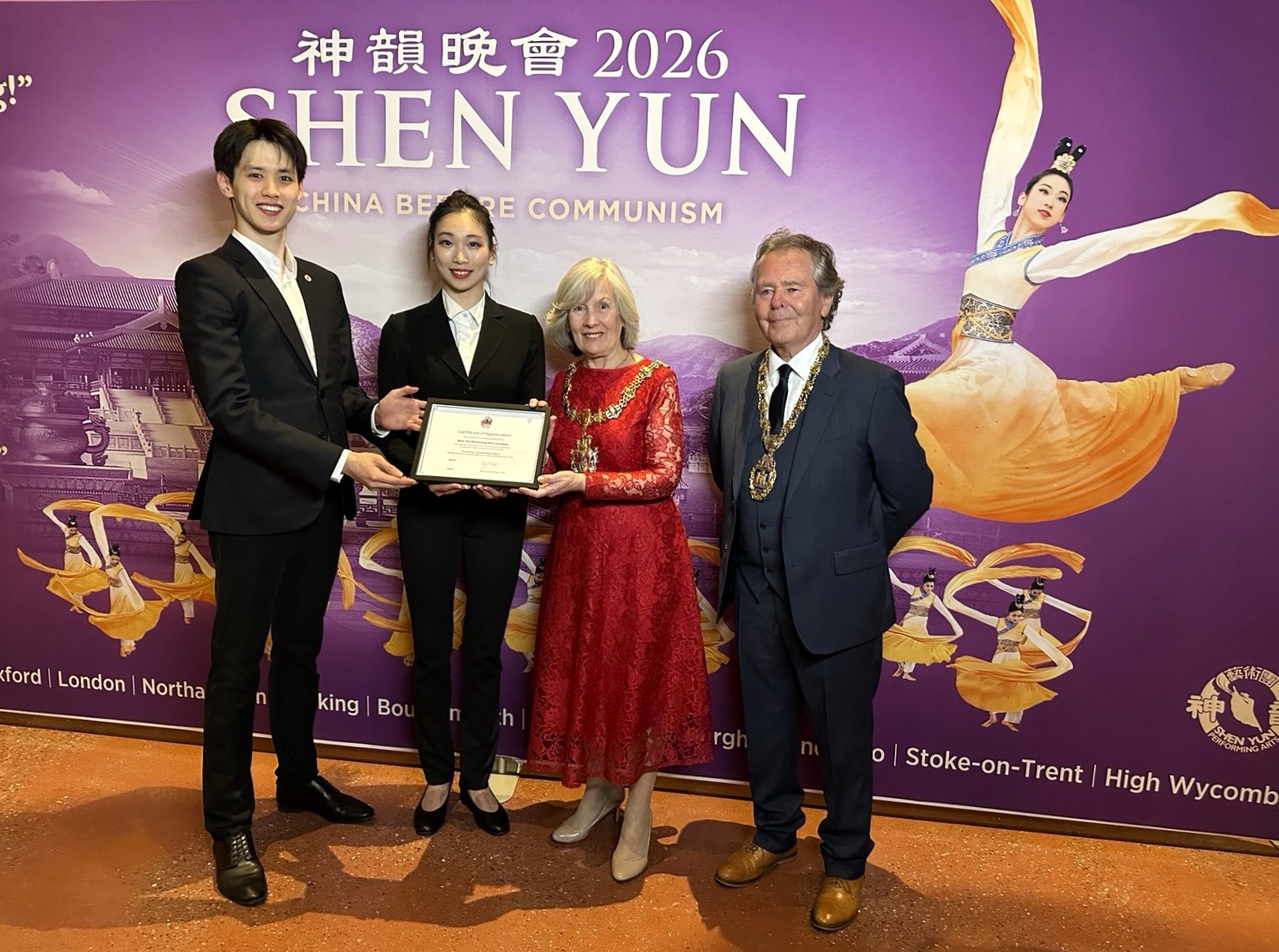 ![]() 3月25日晚,斯旺西市长菲尔波特议员与丈夫向神韵艺术家代表颁发感谢状。 |