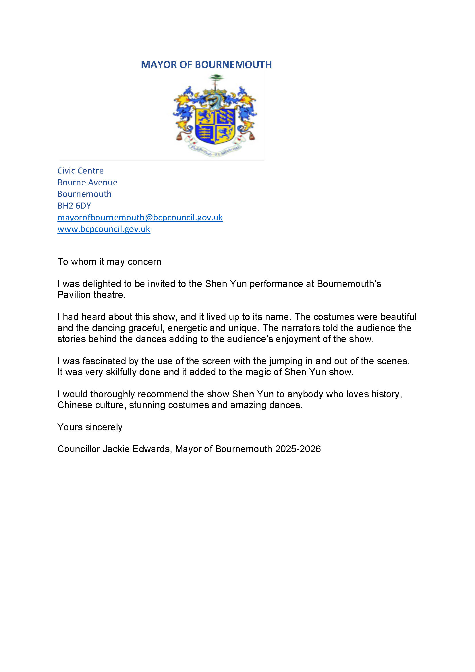 值得一提的是,伯恩茅斯市市长杰姬·爱德华兹在观看演出后盛赞观赏神韵是一场“精彩绝伦的体验”,令人难以忘怀。为表达内心的激动之情,在神韵艺术团离开伯恩茅斯后,她于3月23日专门发来感谢信,表达敬意。她在信中写道: