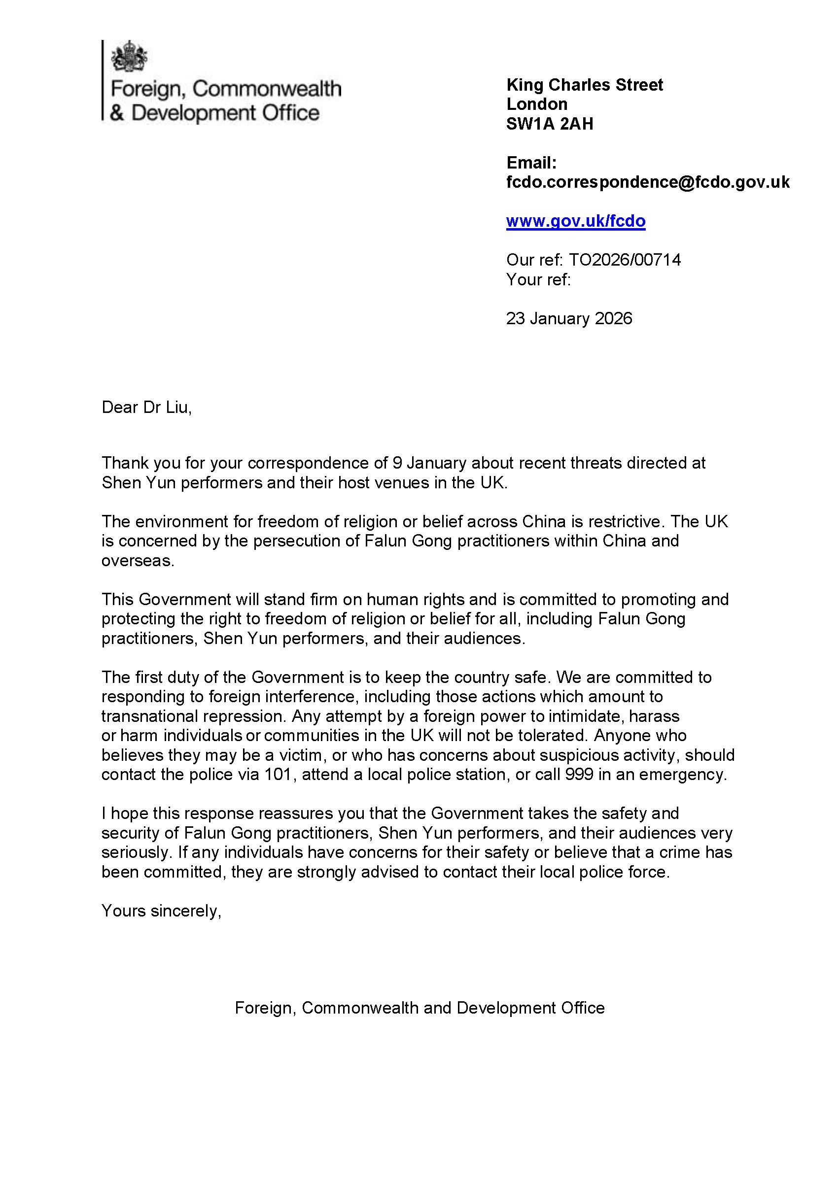 针对上述恐吓威胁事件,英国政府高度重视。鉴于此类行为发生在英国境内,已涉及干扰民主社会言论自由及国家主权的严重问题。2026年1月23日,英国法轮大法学会收到英国外交部来函。针对神韵艺术团在英国巡演期间遭遇的威胁行为,英国政府郑重表示:“任何外国势力试图在英国境内恐吓、骚扰或伤害个人或群体的行为,都是不可容忍的。”同时强调,英国政府高度重视法轮功学员、神韵演出人员及观众的安全保障。
