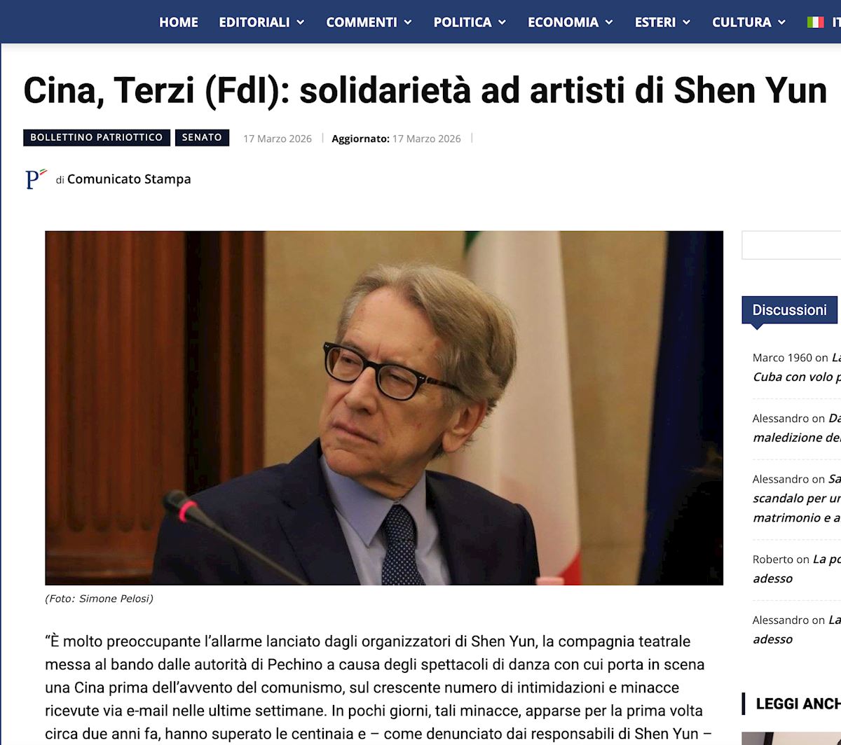 ![]() 意大利前外交部长、参议员朱利奥・特尔齐(Giulio Terzi)致神韵的支持信,发在多家媒体。图为其中一家媒体的网页截图。 |