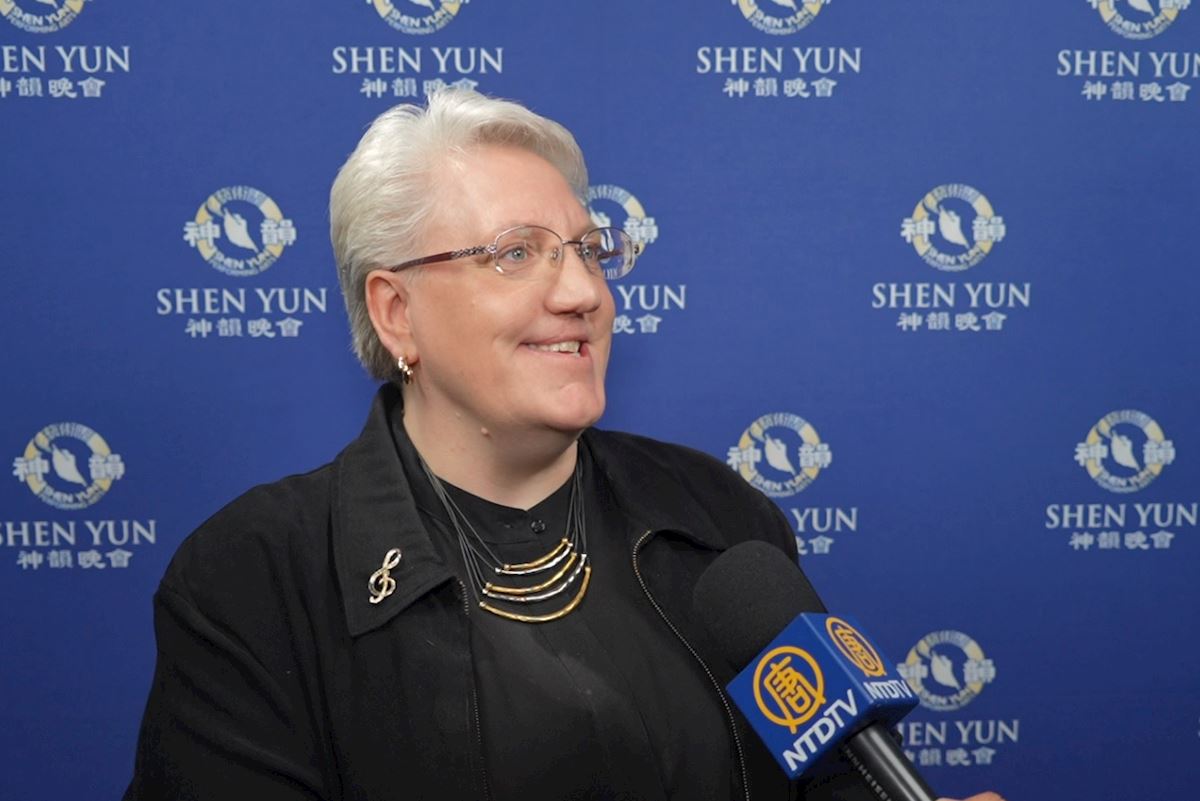 神韵交响乐团中西乐器的结合也深入她心:“我喜欢这种(中西方乐器)组合。真的引人入胜。丰富了整场演出,因为这些乐器有助于讲述故事。”“音乐确实帮助烘托了故事。即使没有歌词或舞蹈,音乐本身也能讲述故事,而把这两者结合起来真是太棒了,让你能同时拥有视觉和听觉的体验。这真是太精彩了。”