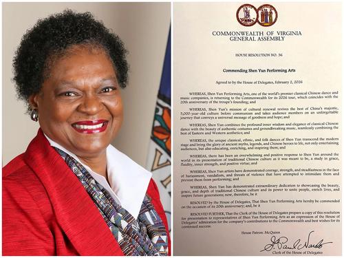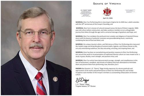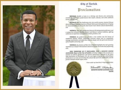 打印机版 | 【投稿/反馈】 文: 弗吉尼亚州法轮功学员神韵艺术团继2026年1月在比邻弗吉尼亚州的美国首都华盛顿特区上演10场之后,将于2026年4月23日、24日在弗吉尼亚州的诺福克(Norfolk)再度上演2场。联邦议员、州议员以及县市政要纷纷颁发褒奖或发来贺信,表彰神韵艺术团对艺术与文化传承的卓越贡献,同时盛赞演出精彩绝伦,欢迎各界民众观赏演出。
