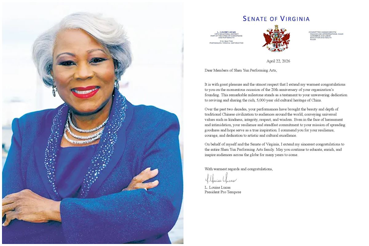4月22日,弗吉尼亚州参议院临时议长L·路易斯·卢卡斯(L. Louise Lucas)发来贺信。贺信中说:“在过去20年中,你们的演出将传统中华文明的美丽与深度带给世界各地观众,传递了善良、正直、尊重与智慧等普世价值。即使面对骚扰与威胁,你们依然展现出坚韧不拔的精神,并坚定履行传播善良与希望的使命,这令人深受启发。我赞赏你们在逆境中的韧性、勇气以及对艺术与文化卓越的不懈追求。”最后,她在信中表示:“愿你们在未来多年继续在全球范围内教育、丰富并启发观众。”