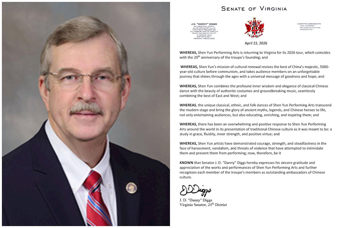 4月22日,弗吉尼亚州参议员 J. D. “丹尼” ·迪格斯 (J.D. “Danny” Diggs)发来祝贺信。信中说:“神韵以文化复兴为使命,致力于重现共产主义之前中国辉煌的五千年传统文化,带领观众踏上一段穿越时空、令人难忘的旅程,传递跨越时代、普世共通的善与希望的信息。”