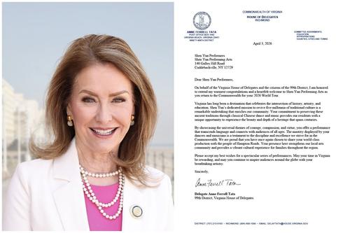 在信中,她表示:“弗吉尼亚州一向以其深厚的历史底蕴、艺术传统与教育精神而闻名。神韵致力于复兴五千年中华传统文化的使命极具意义,也为我们的社区注入了宝贵的文化养分。贵团以中国古典舞与音乐呈现古老文明的精髓,让本州居民有机会感受千年文明的瑰丽与深沉底蕴。” 她还说,“舞蹈家与音乐家的精湛技艺充分体现了我们在本州所追求的严谨与卓越精神。我们为你们再次选择向汉普顿路地区的民众呈现世界级演出而深感自豪。你们的到来不仅丰富了当地艺术氛围,也为本地区的家庭带来充满活力的文化体验。”