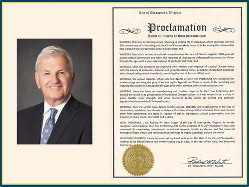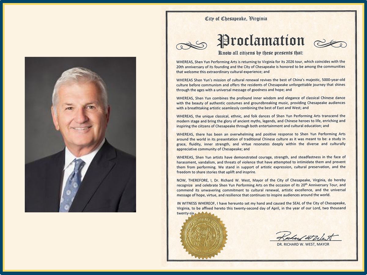 切萨皮克市市长 理查德·W·韦斯特博士(Dr. Richard W. West)在褒奖中写道:“此次巡演恰逢艺术团成立20周年之际,切萨皮克市深感荣幸,能成为此次非凡文化盛事的东道社区;神韵将中国古典舞深邃的内涵与优雅气质,与精美的传统服饰和别具风格的音乐融为一体,将为切萨皮克观众呈献一场融汇东西方艺术精粹、令人叹为观止的绝美盛宴。”;他还表示,“神韵艺术家们在面对骚扰、破坏以及暴力威胁等企图恐吓并阻止其演出的行为,展现了非凡的勇气、力量与坚定不屈的精神;我们坚定支持艺术与文化的自由表达,它们能够鼓舞人心、激发希望。”