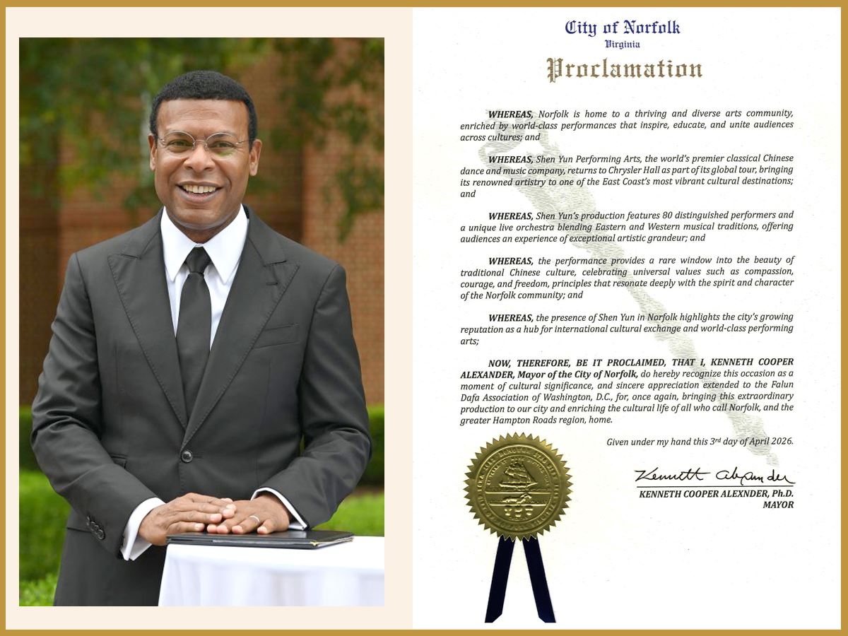 诺福克市市长肯尼斯·库珀·亚历山大(Kenneth Cooper Alexander) 在褒奖中写道,“ 作为世界顶级的中国古典舞与音乐艺术团, 神韵艺术团将在全球巡演期间重返克莱斯勒音乐厅(Chrysler Hall),将其蜚声国际的艺术带至东海岸最具活力的文化之都之一。”