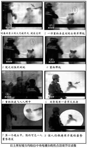 新世紀頭一個大年三十,有5人在天安門廣場自焚,一人死亡四人受傷。官方媒體一反常態,反應迅速,說這是來自河南的法輪功成員。一周後,新華社報道突然把當初的5人自焚變成了7人,後來添加的兩人剛好都“自焚未遂”,可以現身說法,把自焚的責任推到法輪功身上。 法輪功正在遭受歷史上少有的迫害,真正的法輪功修煉者,怎麼會去干有損於法輪功的事,為當局進一步鎮壓制造借口,那麼,是誰制造了天安門自焚的悲劇? 海外媒體指出,天安門自焚很可能是一場意圖陷害法輪功、嚴重失實的偽案。 疑點之一: ──“焦點訪談”慢鏡頭分析 請用慢鏡頭仔細觀察2月4號的中央電視臺播出的焦點訪談,會發現死者(劉春玲)不是被火燒死而倒地的,而是有人在死者的背後用重物猛擊其後腦致死。使死者來了個180度的後轉身,雙手抱頭倒地而死。期間擊死者用的重物從死者腦後飛出數米遠。